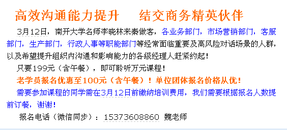 3月12日,南开大学名师李晓林来秦做客,各业务部门,市场营销部门,客服部门,生产部门,行政人事等职能部门等经常面临重要及高风险对话场景的人群,以及希望提升组织内沟通和影响能力的各级经理人赶紧约起!